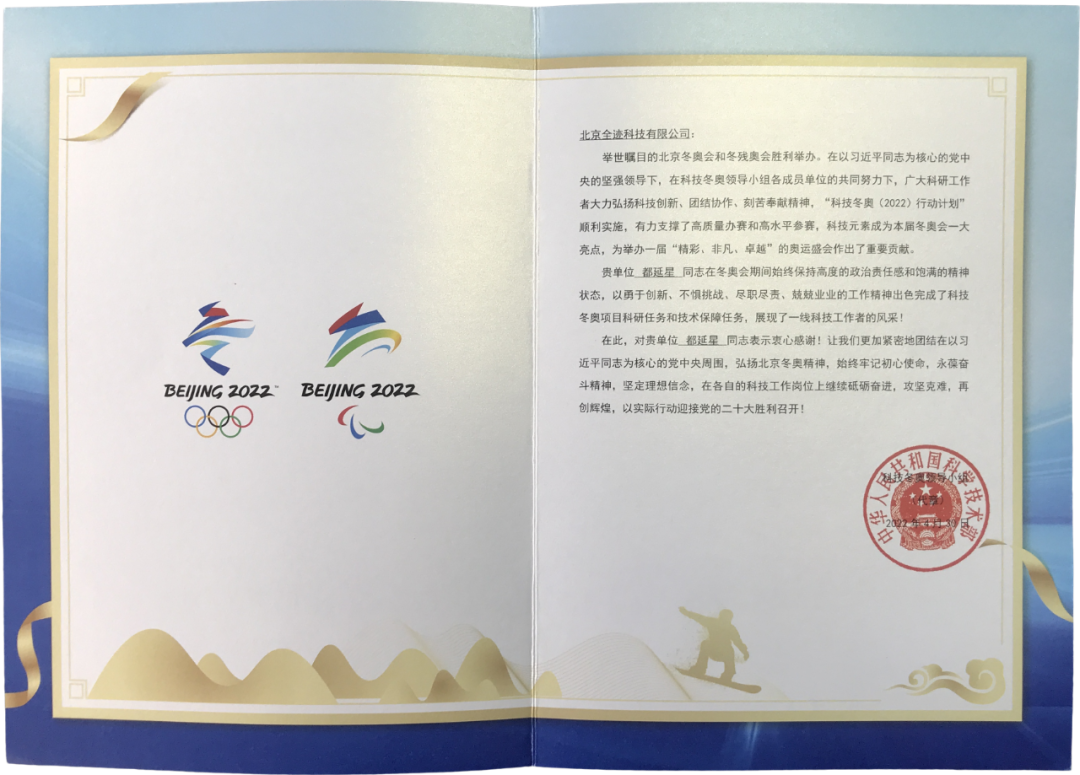 近日,全跡科技收到科技冬奧領導小組(科技部代章)發來的感謝信。感謝北京全跡科技有限公司在北京冬奧會期間的工作支持和突出貢獻。
